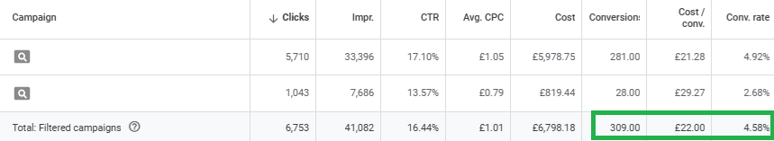 For this particular business, my client chargers a minimum on average £200 (not including upsells). This means from the Google Ads enquires alone, he has made a potential of £61,800